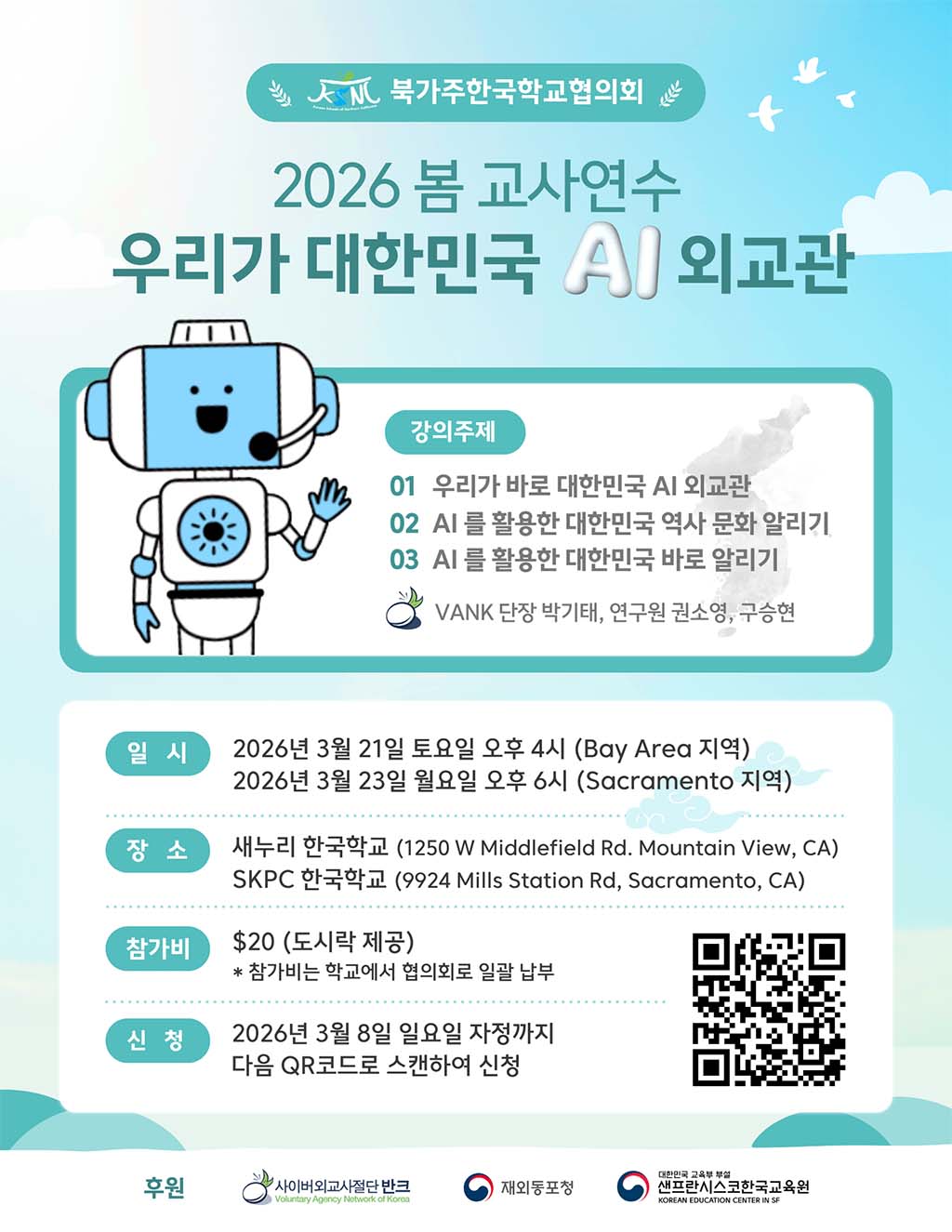 양 기관은 협약 체결과 함께 첫 사업으로 북가주 한국학교 교사들을 대상으로 ‘우리가 대한민국 AI 외교관’ 연수 프로그램을 진행한다. 이번 연수는 베이 지역과 새크라멘토에서 찾아가는 방식으로 열리며, 3월 21일 오후 4시와 3월 23일 오후 6시 두 차례 진행된다.