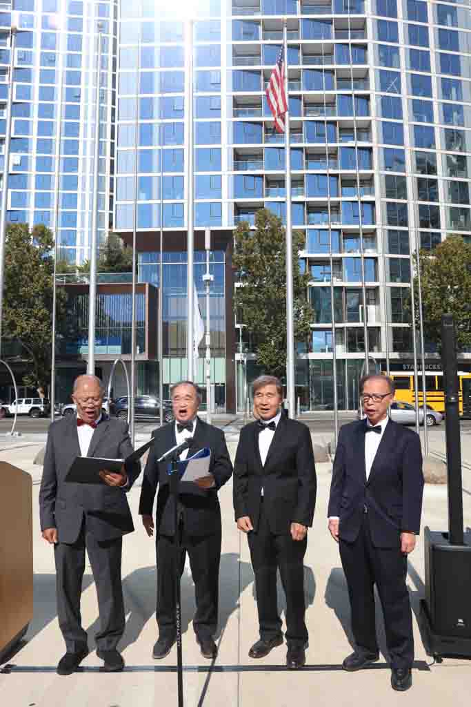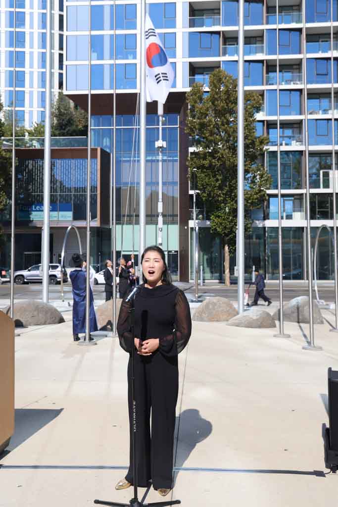 축사에 이어 베이시니어테너(BST) 중창단이 미국 국가를 부르는 가운데 김순란 김진덕 정경식 재단 이사장, 유니스 전 관장, 드류 백 대표가 성조기를 게양했으며, 이어 이윤정 소프라노가 애국가를 불렀고 김한일 회장, 구은희 이사장, 나상덕 부총영사가 애국가에 맞춰 태극기를 게양했다.