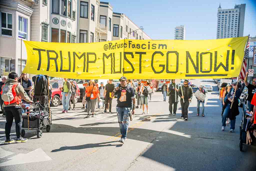 국제 여성의 날을 맞아 샌프란시스코에서 개최된 집회에서 참석자들이 트럼프 반대 구호가 적힌 플래카드를 들고 행진하고 있다. 사진 = ProBonoPhoto.org / Photo by Nate Love @nate___love.