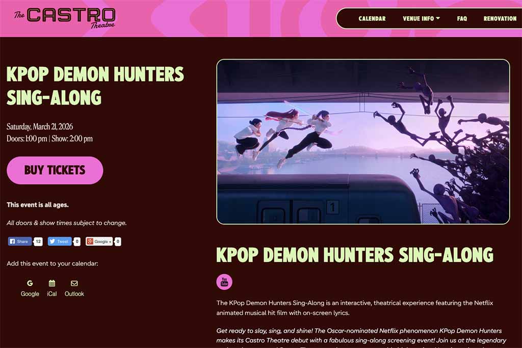 샌프란시스코의 대표적인 공연장인 카스트로 극장에서 넷플릭스 애니메이션 뮤지컬 영화 ‘K-팝 데몬 헌터스’ 싱어롱 상영 행사가 열리는 것. 이번 행사는 관객들이 영화 속 노래를 함께 부르며 즐길 수 있는 참여형 상영 이벤트로 마련됐다. 음악과 영화, 팬 참여가 결합된 이번 이벤트는 한류 문화가 지역 문화 공간에서도 적극적으로 소개되고 있다는 점에서 관심을 모으고 있다.
