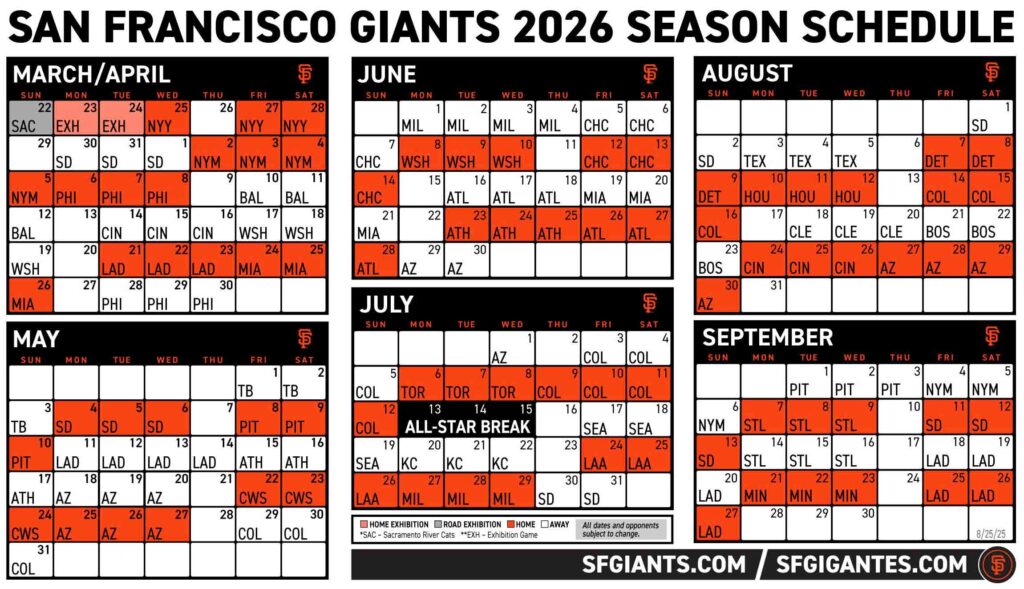 가장 긴 홈 일정은 8월 7일부터 16일까지 이어지는 9연전이다. 디트로이트 타이거스(8월 7~9일)와의 3연전을 시작으로 휴스턴 애스트로스(8월 10~12일), 콜로라도 로키스(8월 14~16일)가 차례로 오라클파크를 찾는다.
