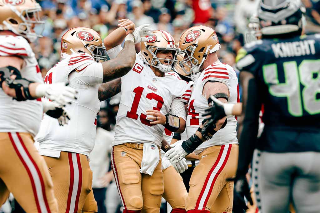 패스를 성공시킨 뒤 동료들과 기뻐하는 브록 퍼디 49ers 쿼터백. 사진 49ers.