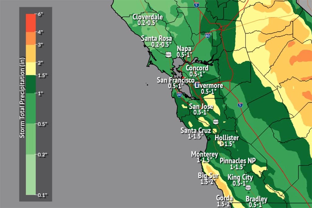 국립기상청(NWS)은 샌프란시스코, 오클랜드, 산호세 등 주요 도시에서 0.5~1인치, 산타크루즈 산맥과 빅서 고지대에서는 최대 2인치의 강우를 예보했다. NWS는 샌프란시스코 10월 평균 강수량인 0.94인치가 하루 사이에 내리는 양이다.