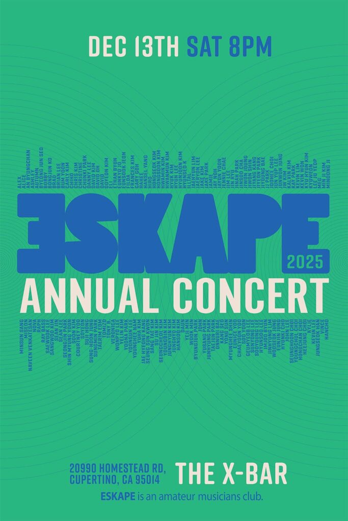 ESKAPE는 오는 12월 13일(토) 오후 8시, 쿠퍼티노에 위치한 X-BAR에서 올해의 마지막을 장식할 대규모 연말 공연을 연다고 밝혔다. 이번 공연은 동아리가 매월 진행해 온 ‘오픈 마이크 나이트(Open Mic Night)’와 정기 세션의 성과를 총정리하는 장으로, 2025년 한 해 동안 성장한 멤버들의 음악적 결과물을 한 자리에서 볼 수 있는 무대다.