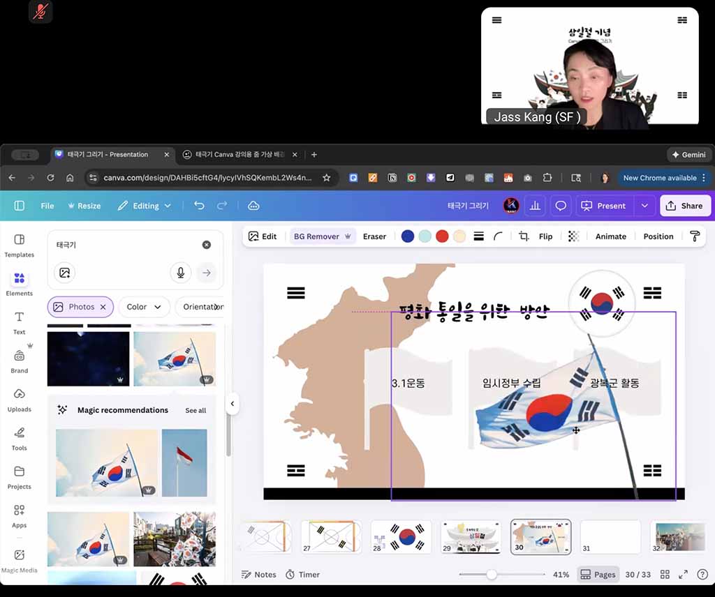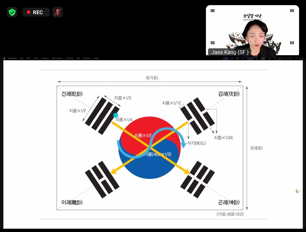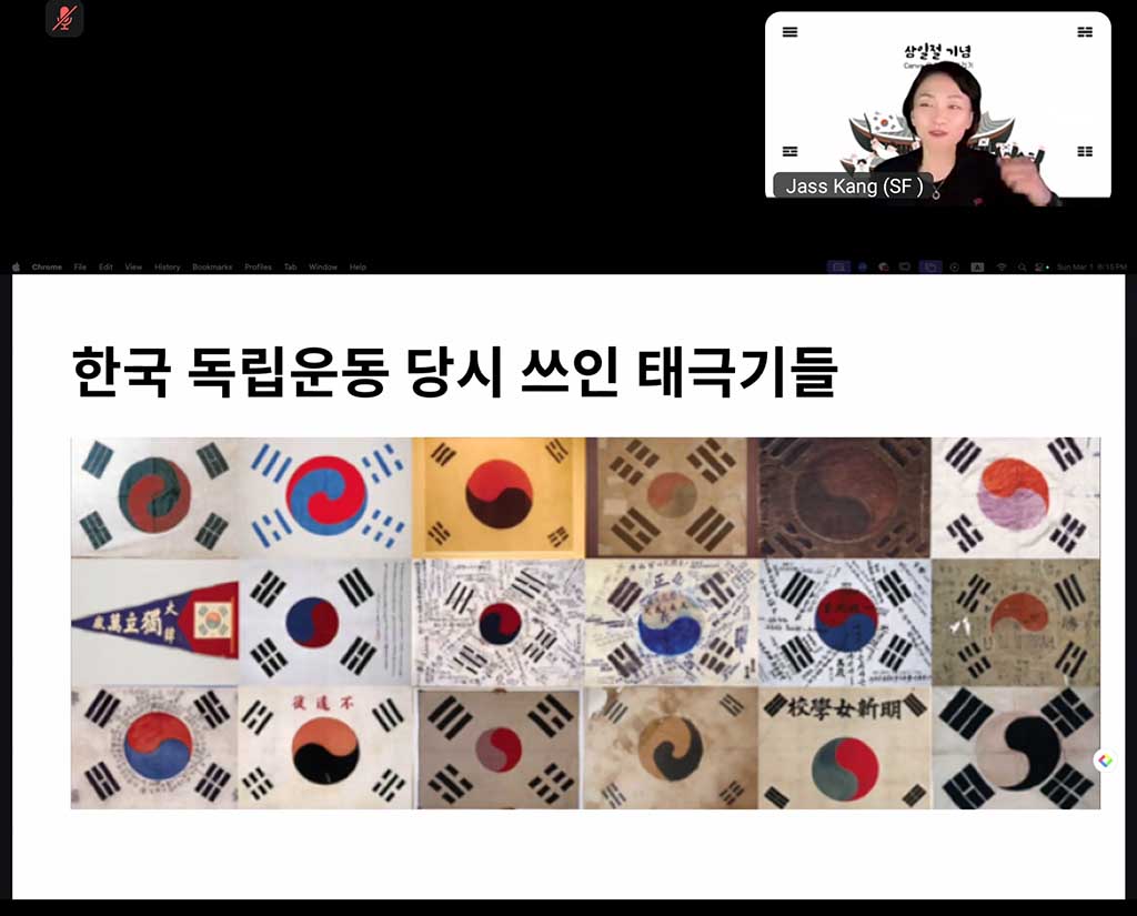 이번 행사는 ‘어제의 독립을 기억하고, 내일의 통일을 디자인하다 – CANVA로 완성하는 하나의 코리아’를 주제로 기획됐다. 사회를 맡은 제스 강 간사는 행사 초반 참가자들과 3·1운동 관련 상식 퀴즈를 나누며 분위기를 이끌었다. 이어 1919년 3월 1일 만세운동의 역사적 배경과 의의를 설명하고, 태극기의 제작 과정과 상징, 시대에 따라 달라진 태극기 형태를 소개했다. 특히 온라인 디자인 도구인 캔바를 활용해 태극기를 직접 제작하는 과정을 시연하면서 참가자들의 흥미를 높였다. 단순한 강의 형식을 넘어 디지털 플랫폼을 접목한 참여형 수업으로 진행됐다는 점에서 의미를 더했다.