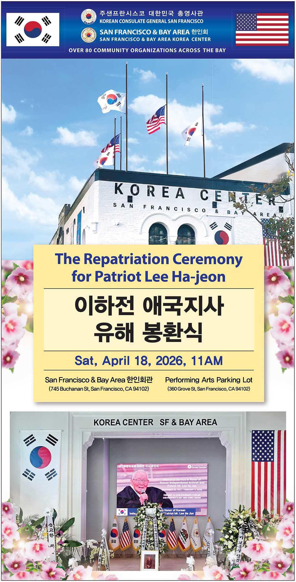 한인회는 이하전 애국지사 유해봉환식을 오는 4월 18일 오전 11시 샌프란시스코 한인회관에서 개최한다고 밝혔다. 이번 행사는 이하전 지사의 유해를 대한민국 국립묘지에 안장하기에 앞서 미주 한인사회가 한자리에 모여 고인의 뜻을 기리고 감사와 존경의 마음을 전하는 자리로 마련된다.